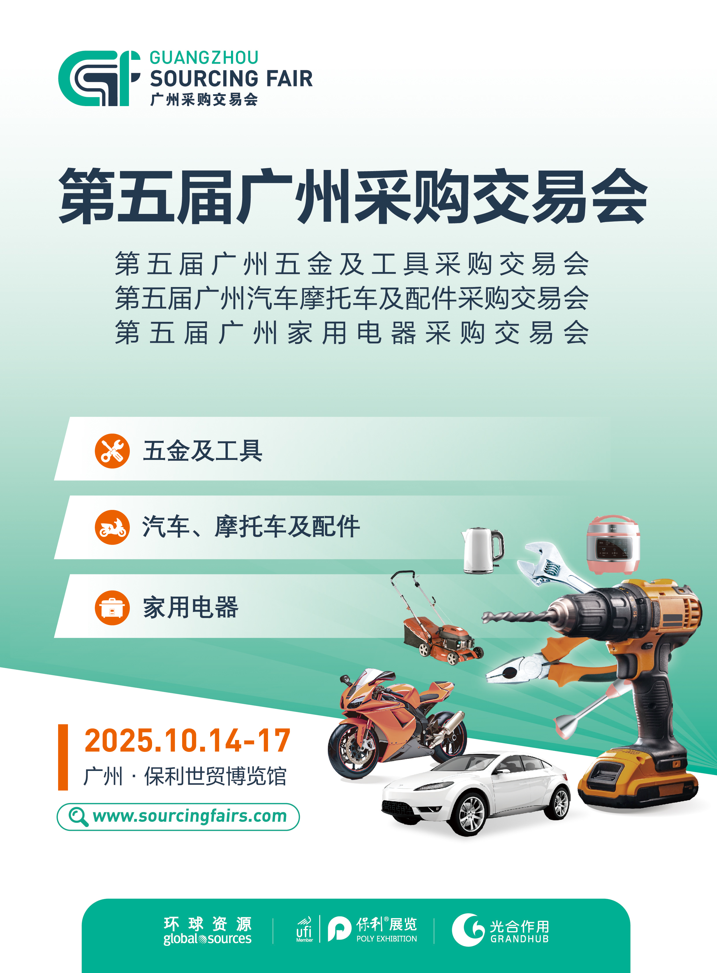 由环球资源、保利展览和光合作用共同打造的“第五届广州采购交易会”将于2025年10月14-17日在广州保利世贸博览馆举行。本届展会将为650家参展企业与35,000名专业买家打造五金及工具、汽车摩托车及配件、家用电器专业出口贸易平台,助力中国企业走出去,加速打开贸易渠道。