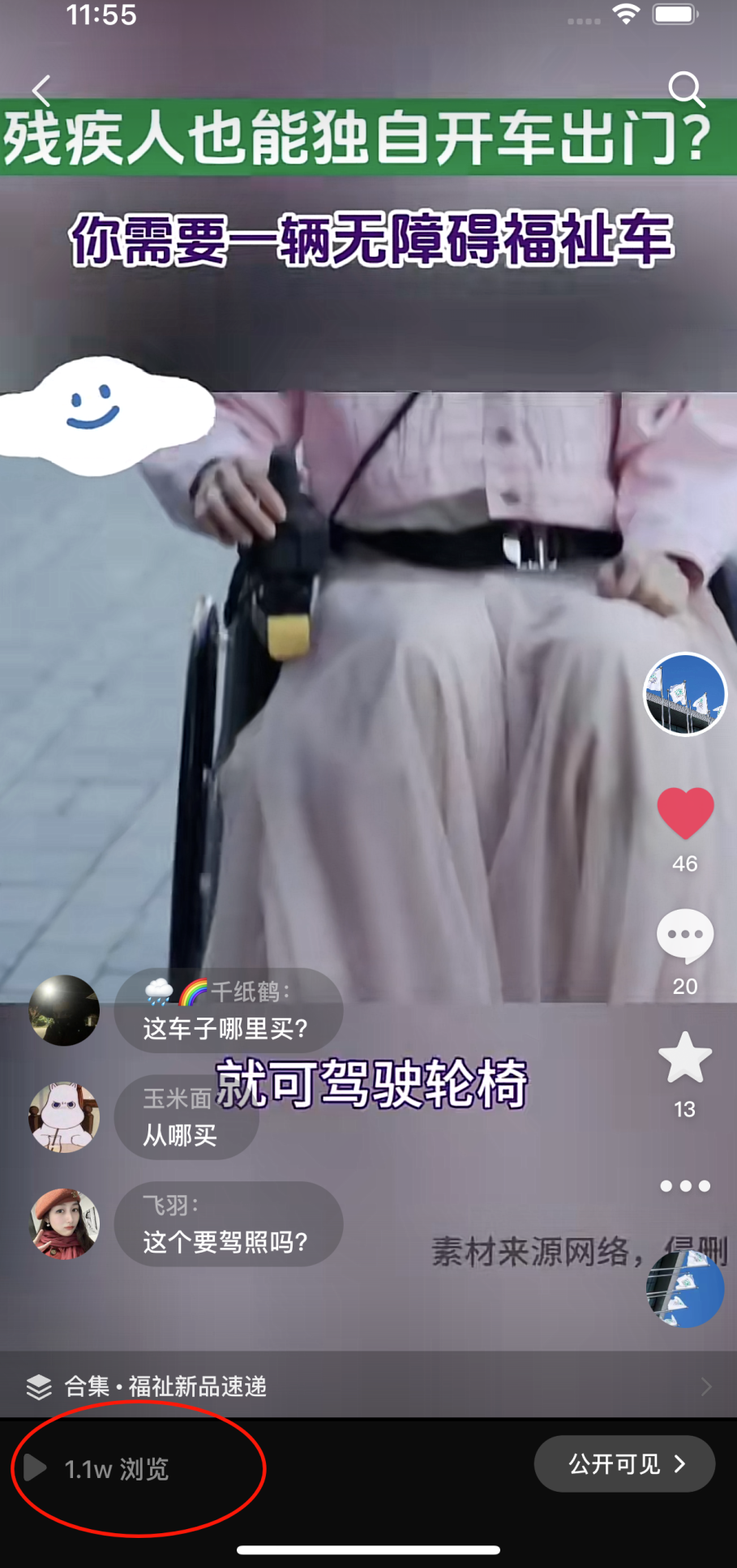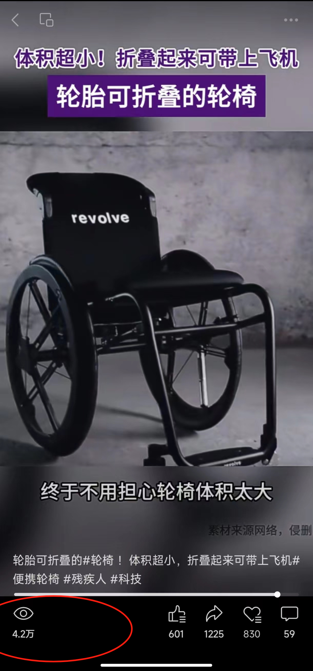 产品案例:近期,折叠轮椅、福祉车等新产品在福祉视频平台发布后,产品类目的播放量直线提升,讨论度火热,短时间内收获20 来自b端、c端的询价。