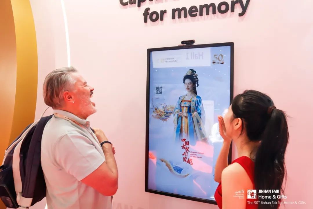 五十届纪念照片墙、特色logo打卡点、ai古装变装等活动吸引了众多买家驻足观看,纷纷前往合影留念,记录下这一特别时刻。