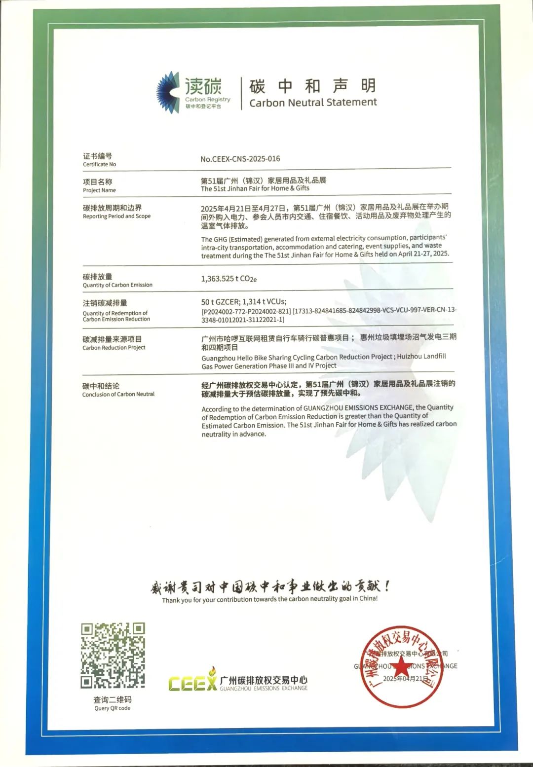 第51届jinhan fair积极践行绿色低碳理念,通过全过程贯彻减排措施,再对展会举办过程中碳排放量进行精准预估,最后通过使用1364吨广州碳普惠等自愿减排量抵消了本次展会所产生的碳排放量,达到二氧化碳收支相抵并最终实现碳中和,在本届展会上获颁“碳中和声明”证书,对展会行业绿色发展起到了示范作用,有效推动了整个行业绿色转型升级。